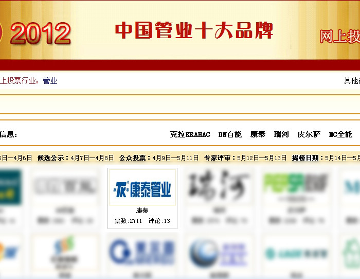 圖為康泰塑膠科技集團獲2012年中國管業(yè)十大品牌評選網頁