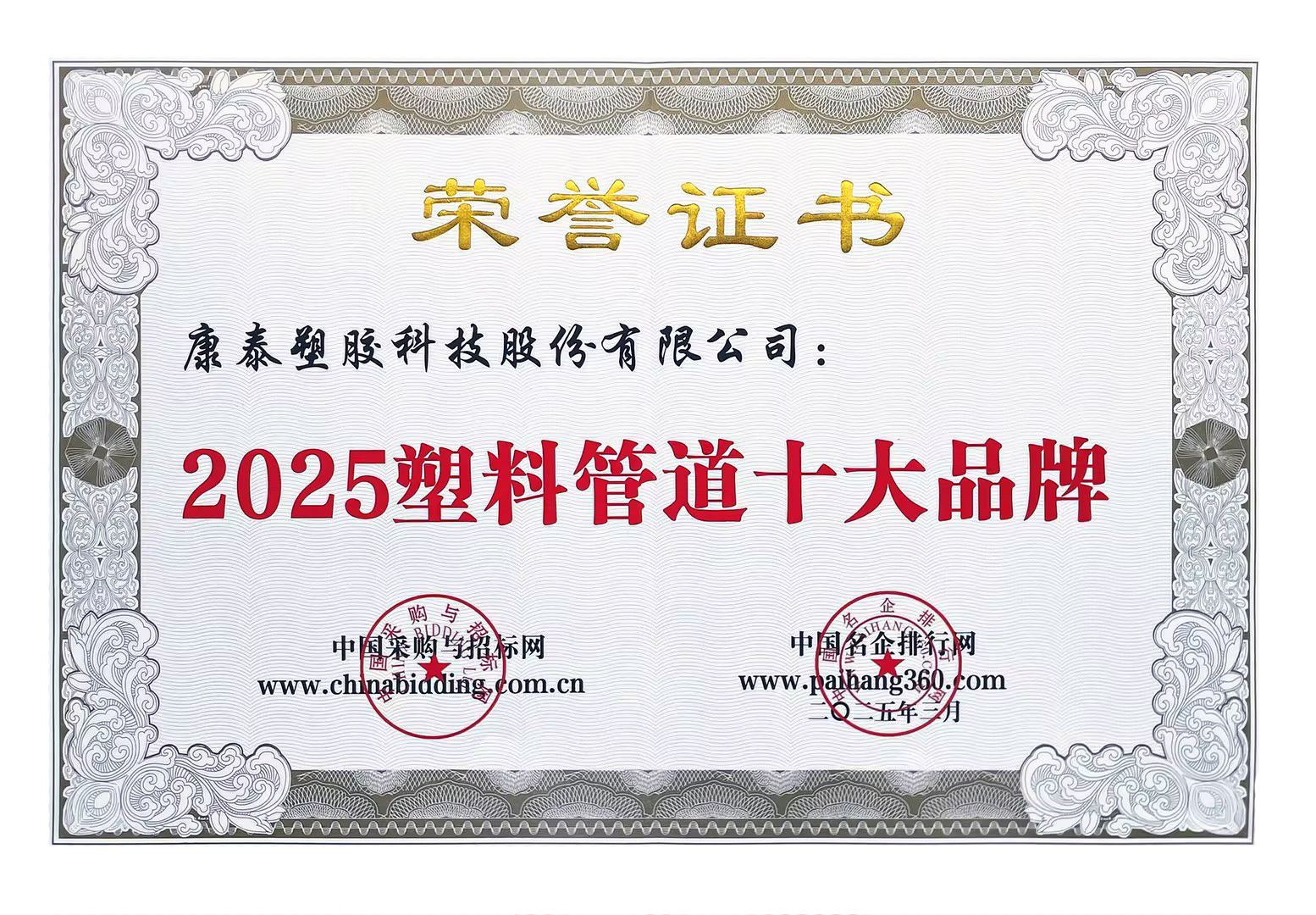 康泰集團(tuán)榮獲“2025塑料管道十大品牌”、“2025家裝管道十大品牌”等稱號(hào)2025/03/24 4653日前,在中國(guó)采購(gòu)與招標(biāo)網(wǎng)、中國(guó)名企排行網(wǎng)聯(lián)合主辦的中國(guó)塑料管道評(píng)價(jià)活動(dòng)...read more -
